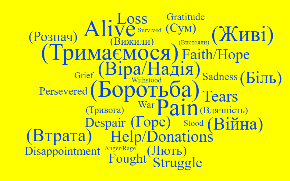 The responses included other highly telling terms. “Anxiety” (Тривога) demonstrates the constant worry and stress due to ever-present danger. “Loss” (Втрата) tragically captures the death and destruction experienced by so many families and communities. And “anger” (Лють) showcases Ukrainians’ fury at the invaders who unleashed this misery, their frustration with ineffective political leadership, and even anger at themselves for not doing more.
